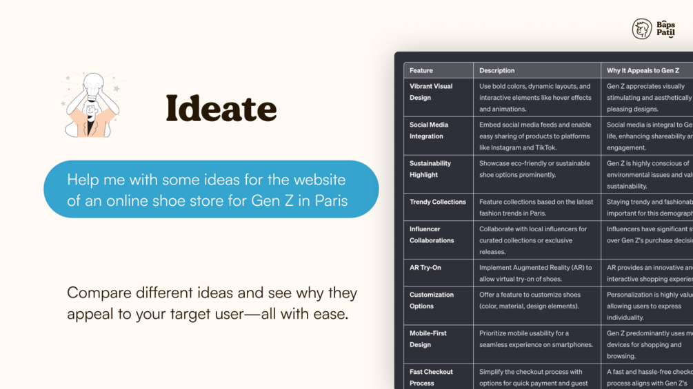 - 💡 Ideation: A brainstorming buddy sparking creative ideas and 'what if' scenarios, turning every session into an idea fest! UX Design GPT helps you with ideas + how each idea caters to your target user.