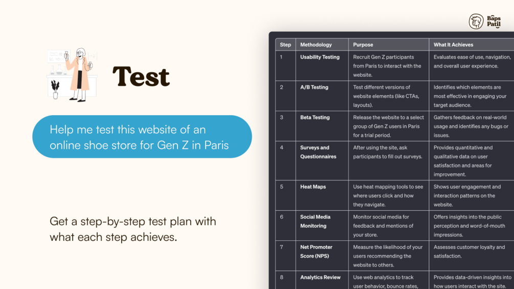 - 🔍 Testing: Guiding your testing strategy, helping you uncover user feedback gems to polish your design to perfection. UX Design GPT provides a step-by-step plan + how each step is helpful!