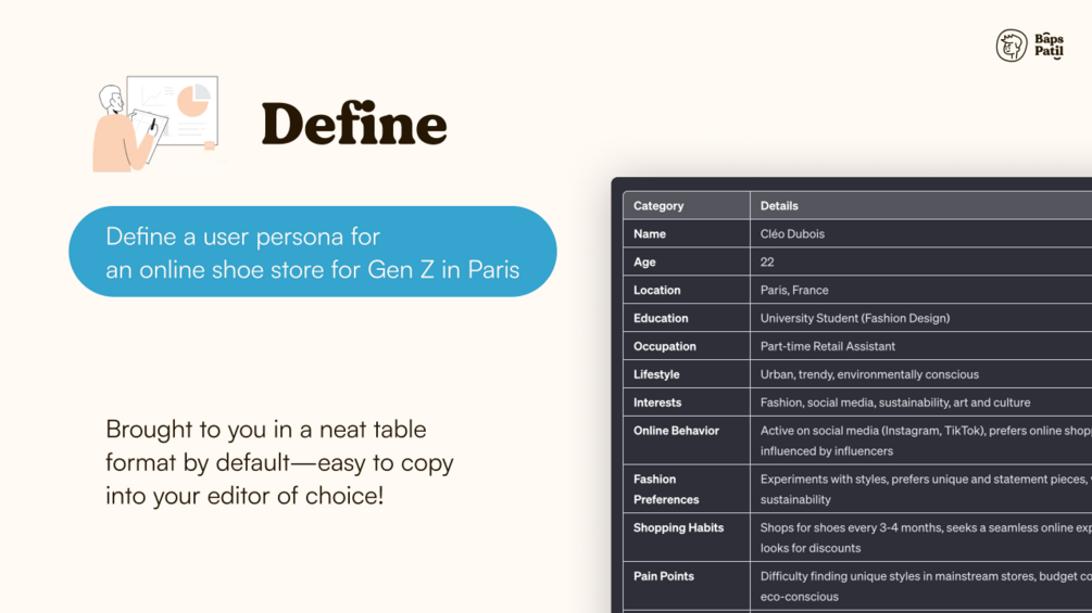 - 🎯 Definition: Your go-to for defining the problem space, turning nebulous ideas into clear, actionable goals. UX Design GPT helps you with defining problems in a structured manner—like presenting detailed user personas in a neat table for easy readability.