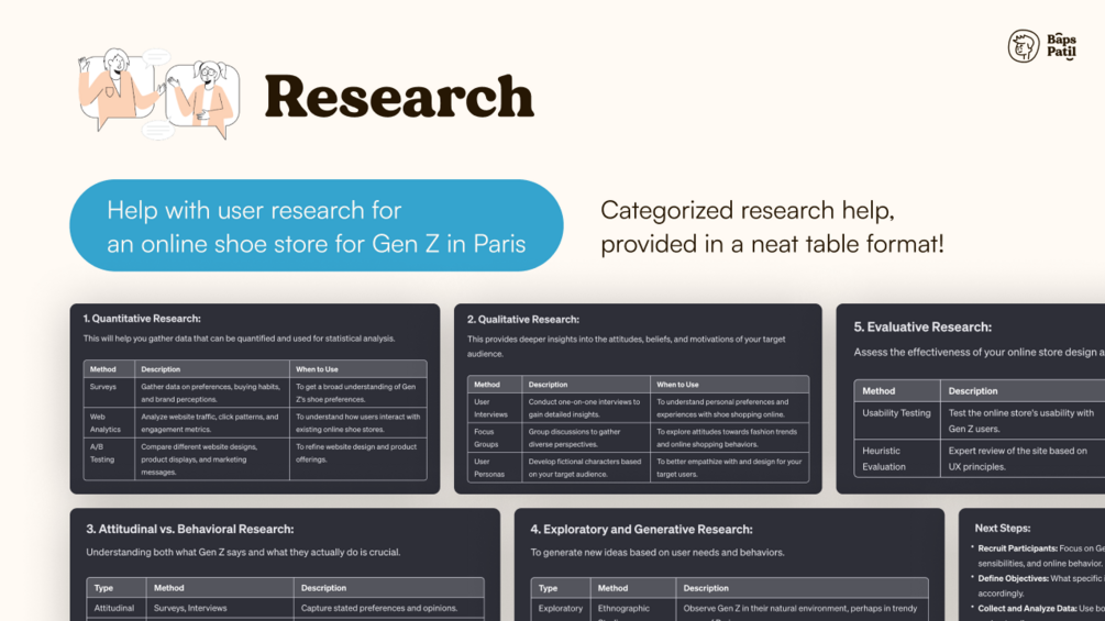 - 🕵️♂️ Research: Like your personal research assistant, digging deep into user needs and surfacing golden insights! UX Design GPT helps you with research methodologies + when to use a specific methodology.
